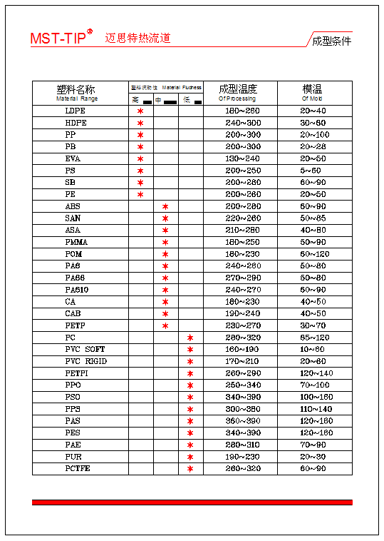 在您了解您的各种需求之后,根据贵司啤塑的塑胶材料,参考以下《成型条件》以及我司的《热咀选择》,请您务必打印填写本页的《技术规范》,并附上2D(AutoCAD)或者3D图档,通过电话、E-mail、传真的方式直接与我司联系,我司会派专人为您服务,谢谢!